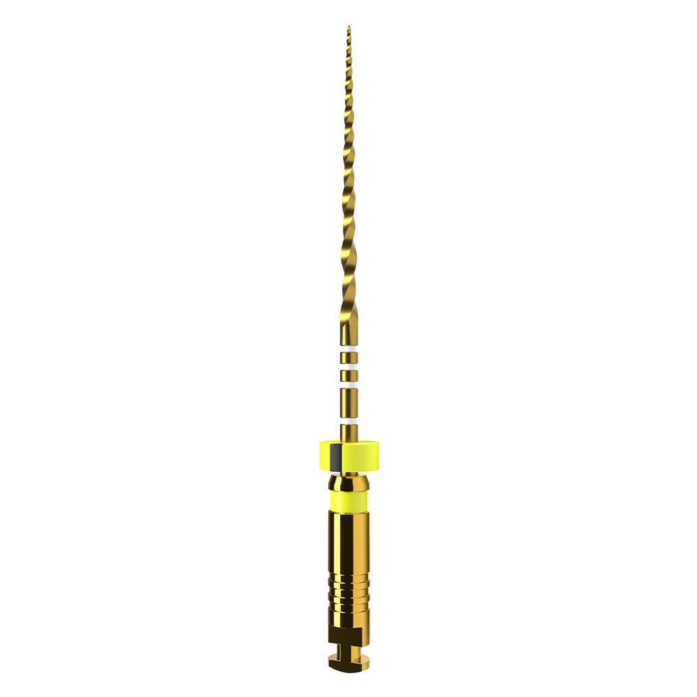 Roterende nikkel-titaniuminstrumenter, ProTaper Ultimate, 31 mm, F1, Finishing File, gul, diameter ved spissen 0,20 mm tilsvarende størrelse 20, taper ved spissen er 7%.