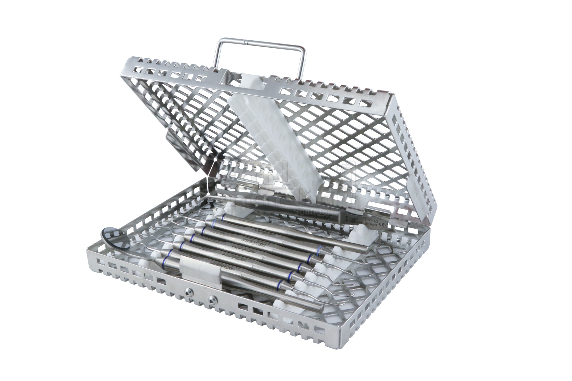 Rustfri stålkassett for 10 instrumenter, 190 × 140 × 34 mm, med hvite silikonholdere. Leveres med lokk og sikker lukking. (instrumenter medfølger ikke)