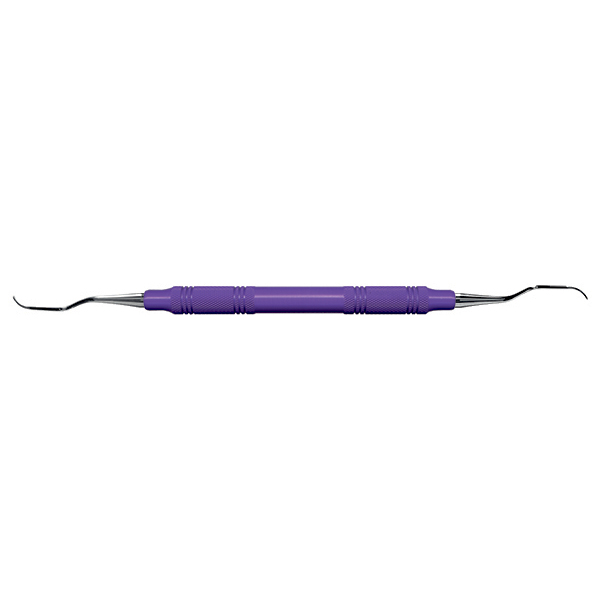 Barnhart Narrow Blade – anterior. Brukes i overkjeve/underkjeve front. Med rundt lilla EagleLite-grep (Ø: 9,5mm). Instrumentspissene er nikkelfrie og laget med Talon Tough-teknologi. Curettern har to skjærende kanter og avrundet tupp.
