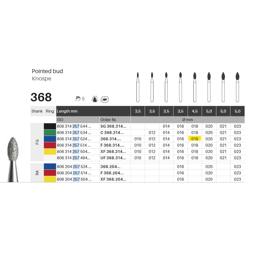 Diamantbor med flere diamantlag i den skjærende delen, noe som gjør boret mer holdbart, effektivt og stabilt. Med «Multilayer Diamond Instrument Guarantee», som er produsentens garanti for et bor med god skjæreevne over lengre tid. Til polering, for FG, knoppformet, medium med blå ring, hodelengde 4,5 mm, 257/018 M (368).