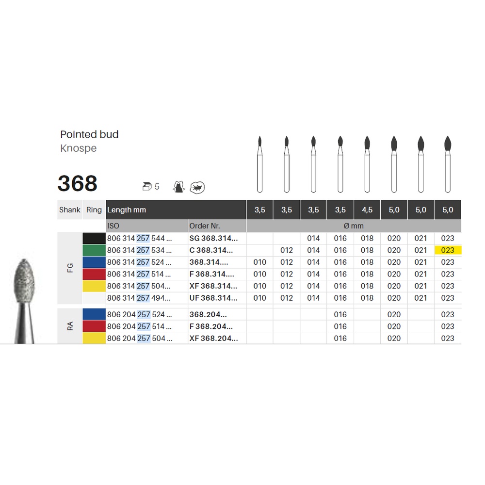 Diamantbor med flere diamantlag i den skjærende delen, noe som gjør boret mer holdbart, effektivt og stabilt. Med «Multilayer Diamond Instrument Guarantee», som er produsentens garanti for et bor med god skjæreevne over lengre tid. Til polering, for FG, knoppformet, grov med grønn ring, hodelengde 5 mm, 257/023 C (368).