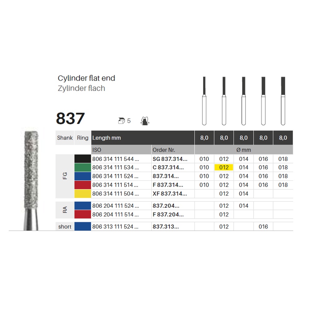 Diamantbor med flere diamantlag i den skjærende delen, noe som gjør boret mer holdbart, effektivt og stabilt. Med "Multilayer Diamond Instrument Guarantee", som er produsentens garanti for et bor med god skjæreevne over lengre tid. Til preparering, for FG, sylinderformet med flat topp, grov med grønn ring, hodelengde 8 mm, 111/012 C (837).