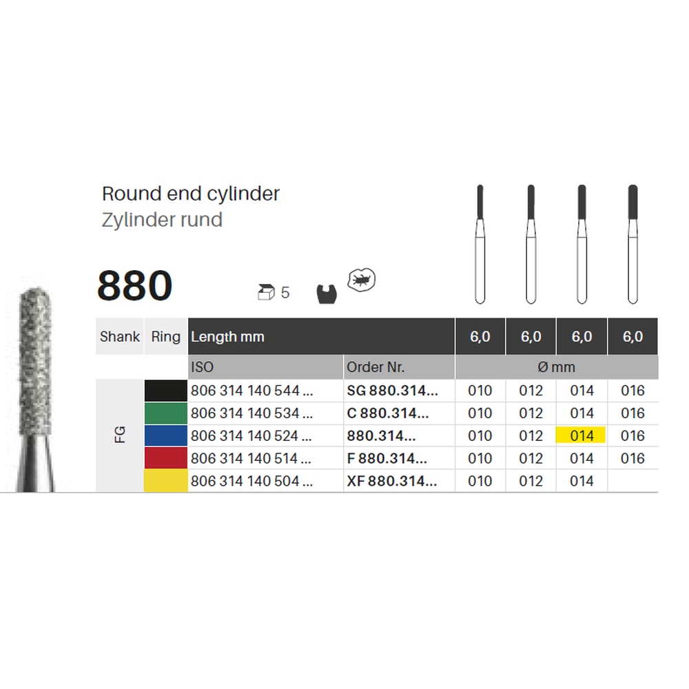 Diamantbor med flere diamantlag i den skjærende delen, slik at boret er mer holdbart, effektivt og stabilt. Med "Multilayer Diamond Instrument Guarantee", som er produsentens garanti for et bor med god skjæreevne over lengre tid. Til preparering, for FG, sylinderformet med rund topp, medium med blå ring, hovedlengde 6 mm, 140/014 M (880).