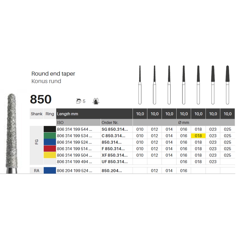 Diamantbor med flere diamantlag i den skjærende delen, noe som gjør boret mer holdbart, effektivt og stabilt. Med «Multilayer Diamond Instrument Guarantee», som er produsentens garanti for et bor med god skjæreevne over lengre tid. Til preparering, for FG, konisk med avrundet topp, grov med grønn ring, hodelengde 10 mm, 199/018 C (850).