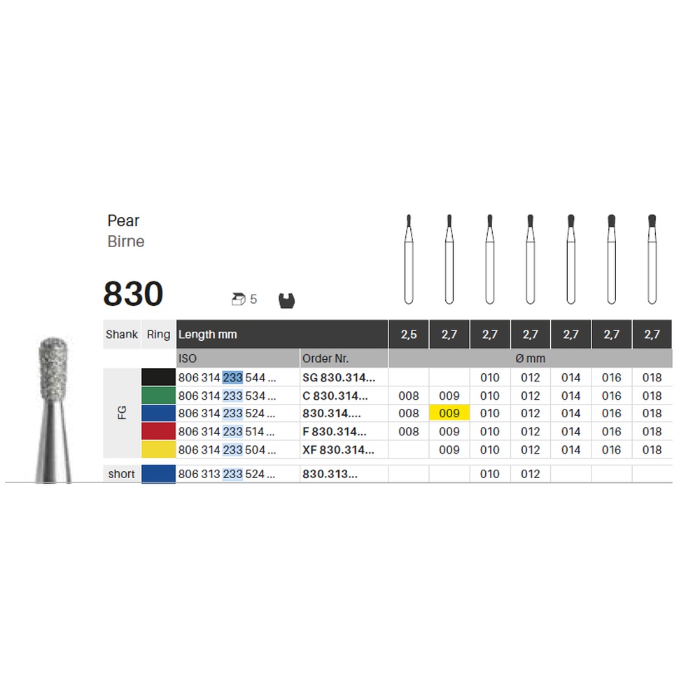 Diamantbor med flere diamantlag i den skjærende delen, slik at boret er mer holdbart, effektivt og stabilt. Med ‘Multilayer Diamond Instrument Guarantee’, som er produsentens garanti for et bor med god skjæreevne over lengre tid. Til preparering, for FG, pæreformet, medium med blå ring, hovedlengde 2,7 mm, 233/009 M (830).