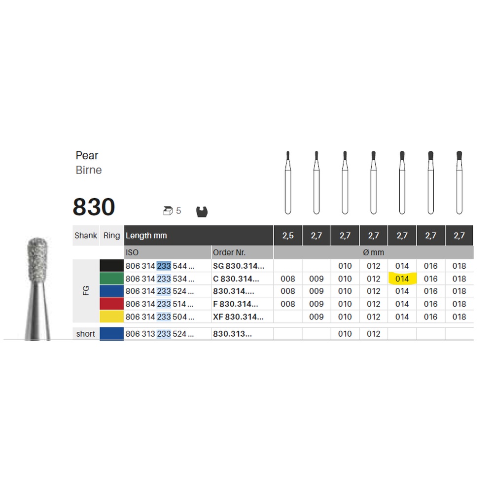 Diamantbor med flere diamantlag i den skjærende delen, slik at boret er mer holdbart, effektivt og stabilt. Med ‘Multilayer Diamond Instrument Guarantee’, som er produsentens garanti for et bor med god skjæreevne over lengre tid. Til preparering, for FG, pæreformet, grov med grønn ring, hovedlengde 2,7 mm, 233/014 C (830)