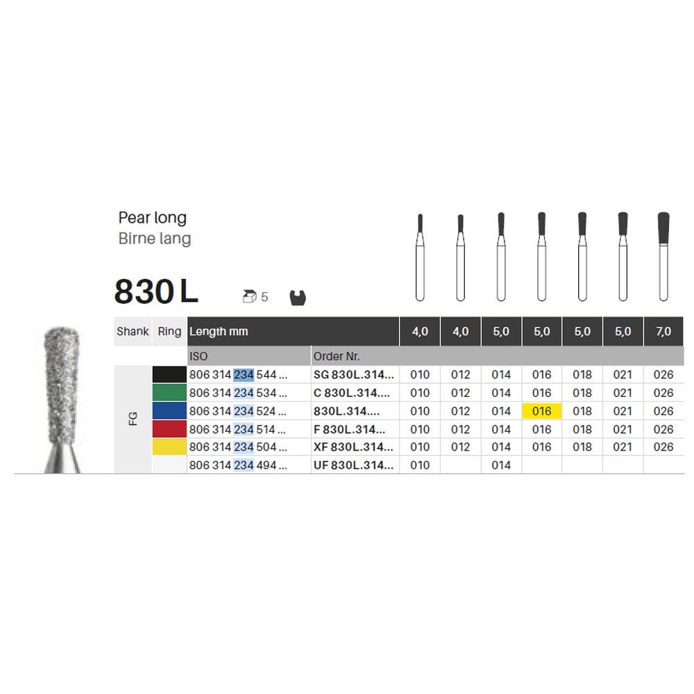Diamantbor med flere diamantlag i den skjærende delen, slik at boret er mer holdbart, effektivt og stabilt. Med "Multilayer Diamond Instrument Guarantee", som er produsentens garanti for et bor med god skjæreevne over lengre tid. Til preparering, for FG, lang pæreformet, medium med blå ring, hodelengde 5 mm, 234/016 M (830L).