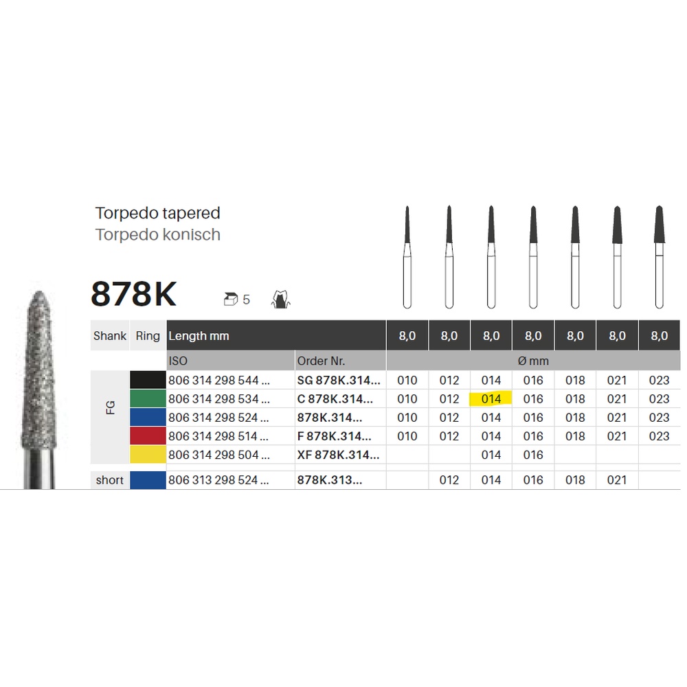 Diamantbor med flere diamantlag i den skjærende delen, slik at boret er mer holdbart, effektivt og stabilt. Med "Multilayer Diamond Instrument Guarantee", som er produsentens garanti for et bor med god skjæreevne over lengre tid. Til preparering, for FG, konisk torpedoformet, grov med grønn ring, hovedlengde 8 mm, 298/014 C (878K).