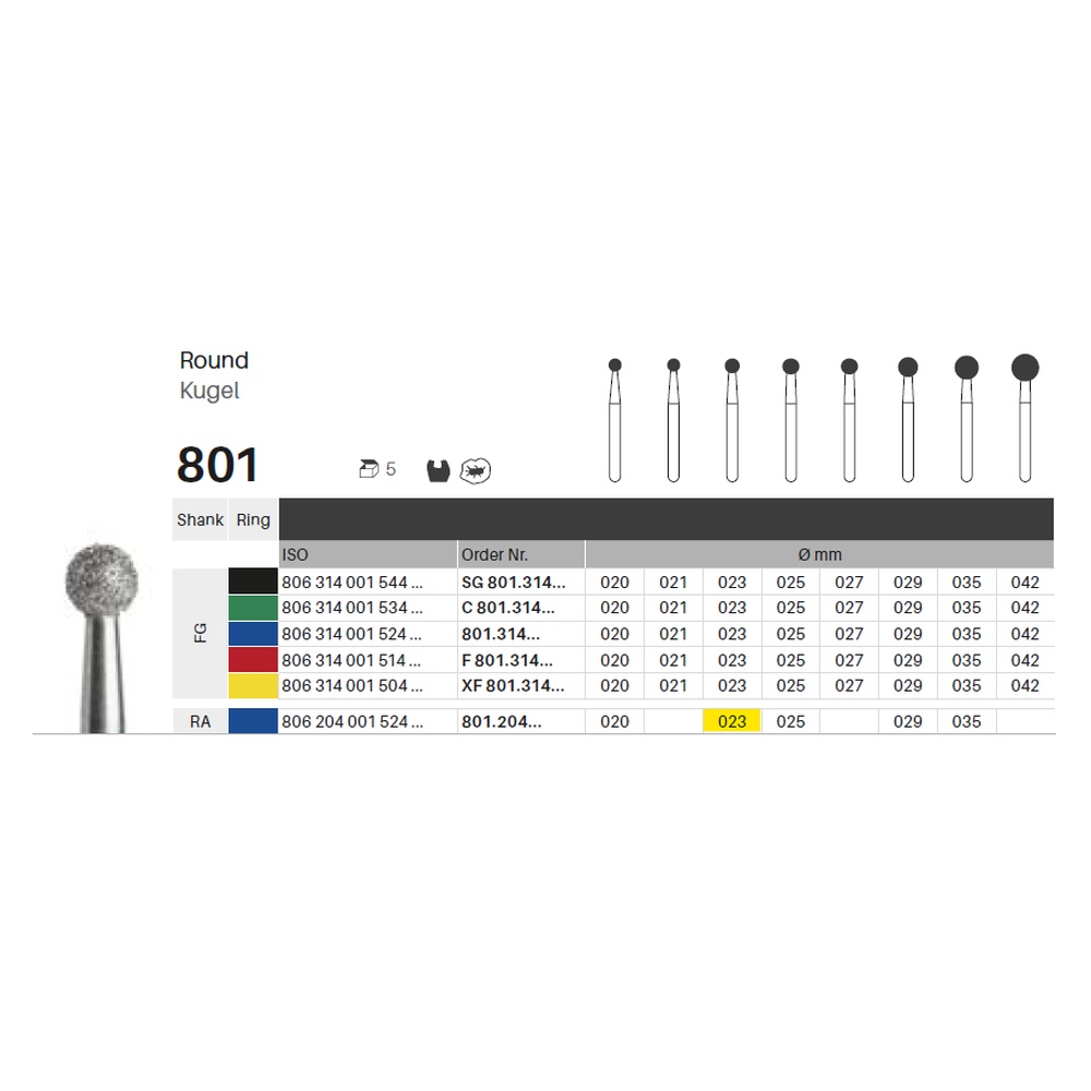 Diamantbor med flere diamantlag i den skjærende delen, noe som gjør boret mer holdbart, effektivt og stabilt. Med "Multilayer Diamond Instrument Guarantee", som er produsentens garanti for et bor med god skjæreevne over lengre tid. Til preparering, for RA, rund, medium med blå ring, hodelengde 2,3 mm, 001/023 M (801).