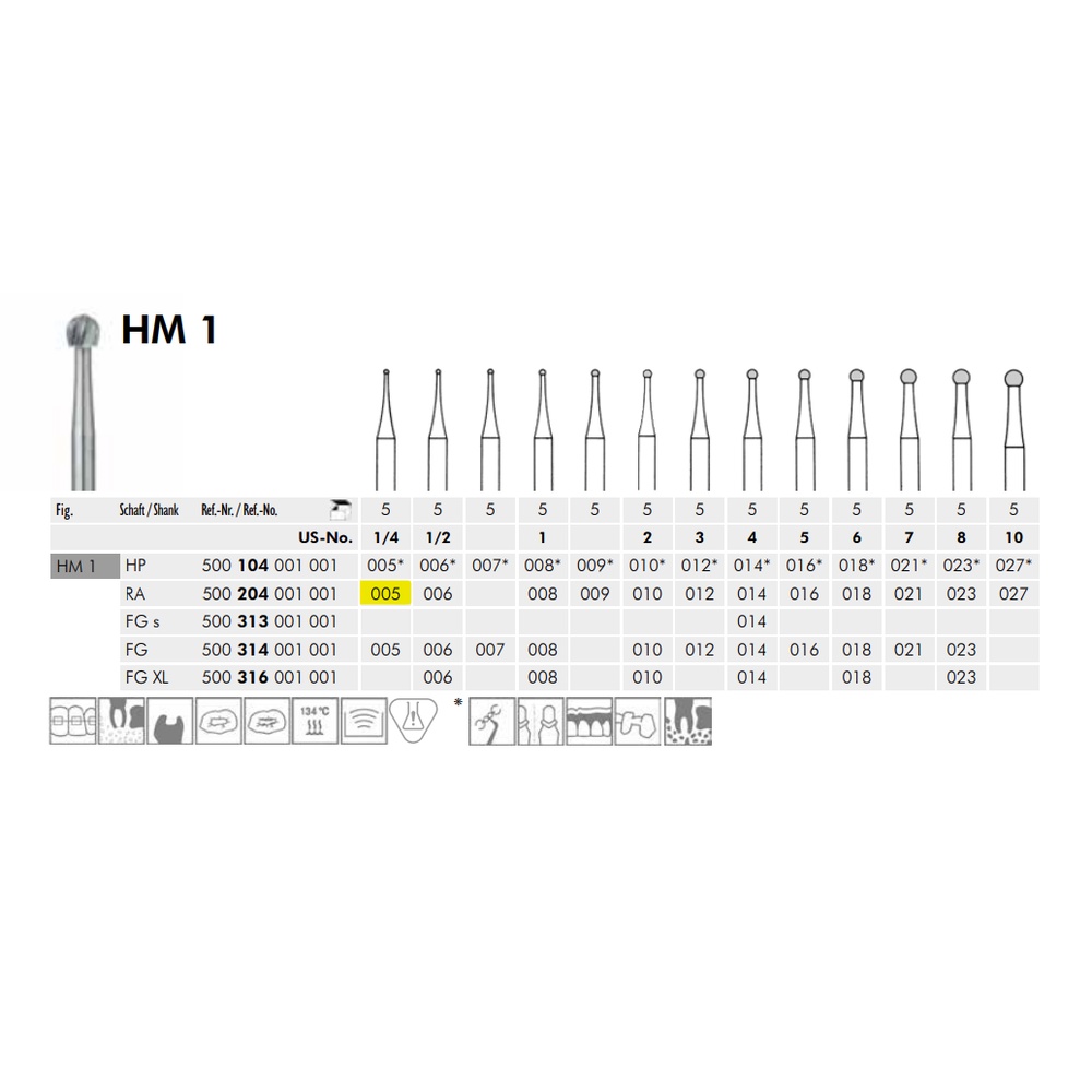 Hårdmetallbor til preparasjon, til RA, HM1/005, kuleformet/roesenbor/rund, størrelse på hodet 0,5mm.