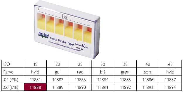 Guttaperkaspisser til rotfylling hvor det er brukt feks SystemGT, Profile, Protaper eller andre nikkeltitaniuminstrumenter. Fargekodede i toppen, GT .06, 28 mm, nr. 15, hvit.