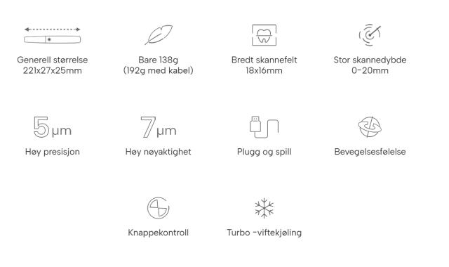 Den avanserte teknologien gir raske og presise skanninger – også i vanskelig tilgjengelige områder. Det kompakte skannerhodet øker pasientkomforten og gir en smidig opplevelse for både behandler og pasient.